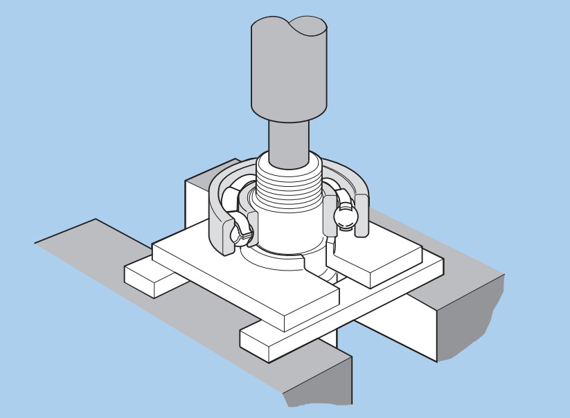 對于小型軸承,可采用如上圖所示的拉拔夾具將軸承拉出,但如果能夠采用如下圖所示的專業(yè)拆卸夾具,以壓出的方法壓出軸承,則更佳,下圖的工具,不僅不會損壞軸承,而且工作效率也更高。