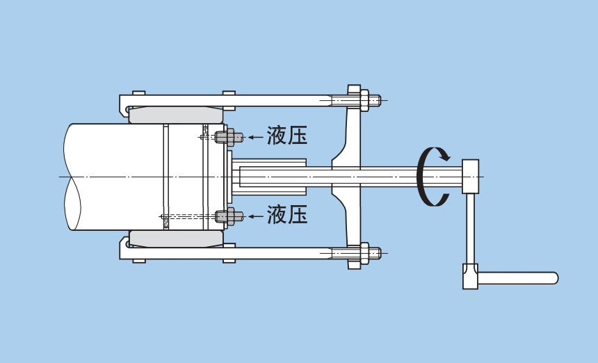 如果是大型軸承,且有非常大的過盈配合量,則軸承與軸咬合較緊,因此較難拆出,而且拆卸的時候容易損壞軸承,這種情況下,通常采用高壓注油的方法,一邊注油,一邊拉拔,最終拉出軸承,具體如下圖所示:
