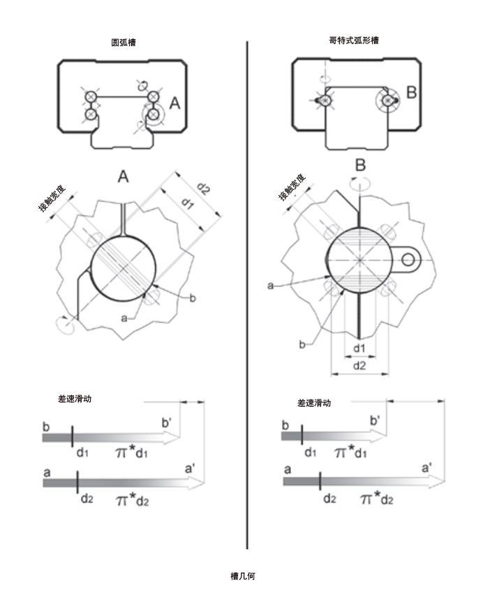 圓弧槽在型軌上有一個接觸面,在車架上有一個接觸面。這將創(chuàng)建兩點接觸。哥特式弧形槽的特殊形狀在型軌和車架上分別創(chuàng)建了兩個接觸面,從而與滾動元件實現(xiàn)了4點接觸。滾動元件的詳細(xì)視圖顯示,滑動差是由接觸直徑d1和d2之間的差異造成的。帶有哥特式圓弧槽的裝置的滑動差明顯大于圓弧槽的裝置。這將導(dǎo)致更高的摩擦系數(shù)、更高的驅(qū)動阻力、更高的磨損和更高的能耗。因此,NTN-SNR的標(biāo)準(zhǔn)線性導(dǎo)軌都有圓弧槽。哥特式弧形凹槽的幾何結(jié)構(gòu)僅用于微型線性導(dǎo)軌,因為其設(shè)計緊湊。