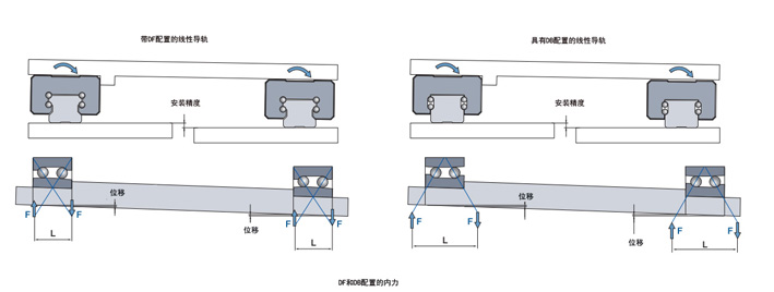 線性導(dǎo)向系統(tǒng)可能會受到安裝故障導(dǎo)致的扭矩應(yīng)力的影響(如下圖)。當(dāng)激活點之間的距離較小時,產(chǎn)生的內(nèi)部載荷也較低。因此,NTN-SNR線性導(dǎo)軌是使用DF配置生產(chǎn)的。