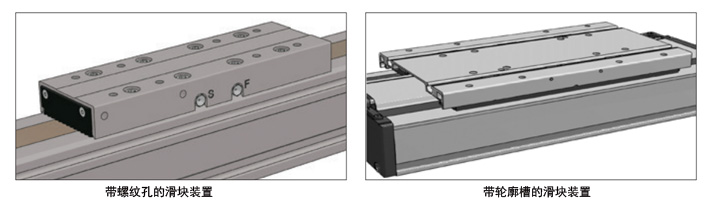滑塊單元是一個復雜的組件組,通常由鋁型材或鋁組件組成。機架或履帶支重輪安裝在滑塊裝置上。滑塊單元還將驅(qū)動元件與直線軸的導向元件連接。滑塊裝置的頂部有螺紋孔或輪廓槽(如下圖),用于固定客戶的延伸部分。