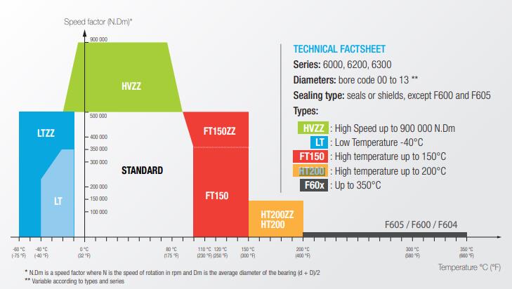 Topline系列軸承分為耐高溫、耐低溫與超高速三種,本文主題的耐高溫Topline軸承由帶磷化MoS2沉積物涂層軸承鋼制成,同時使用聚烷基乙二醇基礎油潤滑脂,可在350度高溫環境連續穩定運行。由于這類材質造價較高,因此在稍微低一點溫度的高溫環境,亦有相對性價比高的軸承,由經過特殊熱處理的軸承鋼制成,使用聚四氟乙烯基礎油潤滑脂,該類軸承可在200度的高溫環境穩定運行,除此外,還有由普通軸承鋼制成,使用高溫潤滑脂(聚脲增稠劑+合成基礎油),可在150度的中高溫環境穩定運行。