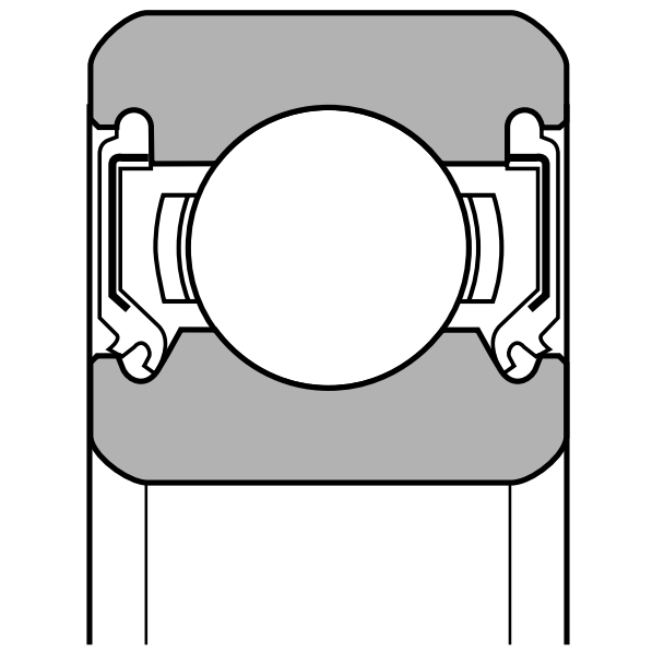 二是LLB型(非接觸密封型),如上圖所示,如上圖所示,密封圈由合成橡膠制成,模制在外圈上,密封圈邊緣沿內圈表面與V型槽對齊,并留有迷宮間隙,密封圈與內圈無接觸,相較ZZ型,LLB型的防塵效果更佳,其他特性與ZZ型基本相同。