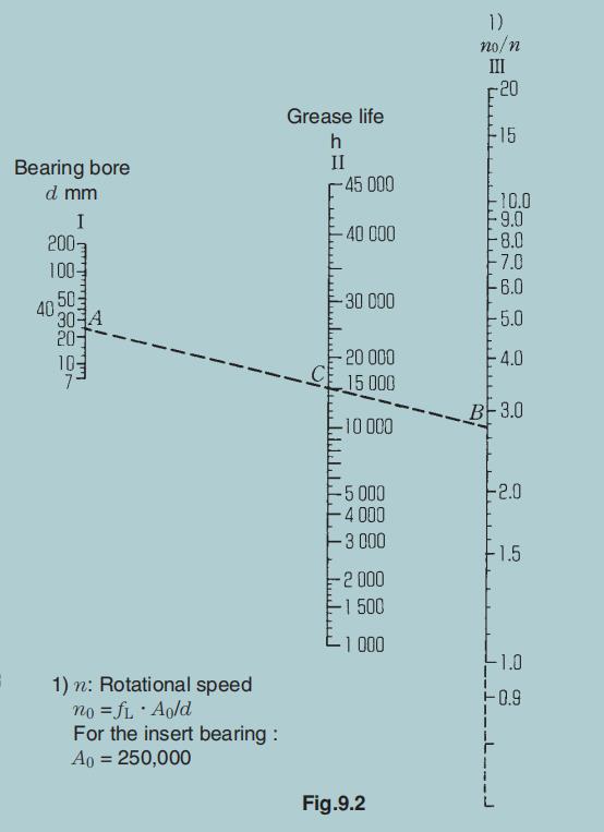 潤(rùn)滑脂的壽命受軸承類型、尺寸、操作條件、溫度、有無(wú)灰塵、水和氣體進(jìn)入的條件影響,并且根據(jù)原材料的礦物油和肥皂基也有很大不同,上圖是計(jì)算NTN軸承單元的潤(rùn)滑脂壽命的示意圖,該圖是基于過(guò)去的結(jié)果和NTN的實(shí)驗(yàn)結(jié)果編制的,適用于軸承工作條件正常的情況,如果已知軸承的類型、孔徑以及允許轉(zhuǎn)速與實(shí)際轉(zhuǎn)速的比率,則可以計(jì)算出潤(rùn)滑脂壽命,以這種方式計(jì)算的潤(rùn)滑脂壽命不是一個(gè)絕對(duì)值,但應(yīng)被視為具有很大安全性的特定指南。