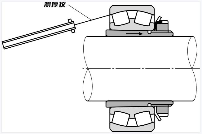 為了測量調心滾柱軸承的徑向內部間隙,應將滾子固定到正確的位置,并在沒有負載的滾子和外圈之間插入測厚儀,如下圖所示,此時,重要的是使用滾筒進行測量,也可以通過測量軸向驅動量而不是徑向內部間隙減小量來獲得適當的干涉。