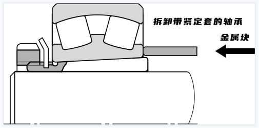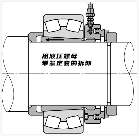 錐形孔軸承的拆卸如下圖所示,通過擰松緊固螺母,在內(nèi)圈上放置一個金屬塊,并用錘子敲擊,拆下使用適配器套筒安裝的小軸承,通過使用液壓拆卸方式,可以方便地使用適配器套筒或拆卸套筒拆卸安裝在錐形軸上的大型軸承。