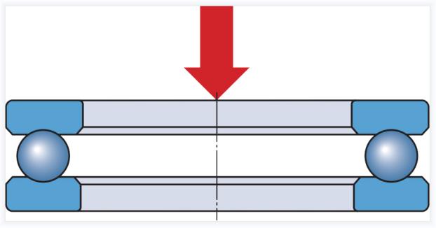 推力軸承承受主要沿軸軸線作用的載荷,根據其設計,推力軸承可在一個或兩個方向上承受純軸向載荷,如上圖所示,有些可額外承受徑向載荷,即組合載荷,如下圖所示,推力軸承轉速較慢,遠低于相同尺寸的徑向軸承。
