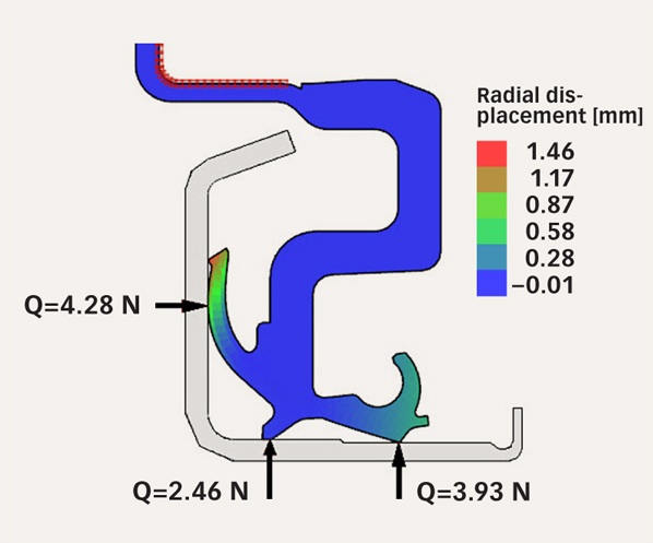 計算安裝在軸上的密封件的能力是一個附加功能,當安裝密封件時,它會在反表面上施加一個力,稱為唇緣力,唇緣力是密封件在靜態(tài)和動態(tài)操作條件下最重要的參數(shù)之一,唇緣力可確保所需的密封性,但也會導(dǎo)致唇緣下的密封摩擦,此外,當密封材料老化時,可以使用彈簧來保持足夠的密封唇力。因此,準確預(yù)測不同操作條件下的唇緣力是模擬工具的關(guān)鍵要求,這將有助于減少設(shè)計迭代次數(shù),從而縮短新產(chǎn)品的上市時間。