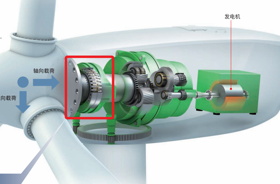 在風(fēng)力發(fā)電機(jī)領(lǐng)域,由于葉片重量較重,因此葉片主軸軸承會(huì)承受穩(wěn)定向下的徑向載荷,又由于葉片與空氣切割產(chǎn)生的推力,因此軸承會(huì)承受穩(wěn)定的軸向載荷,同時(shí)由于葉片旋轉(zhuǎn),因此軸承會(huì)承受旋轉(zhuǎn)載荷,且載荷較大,在西北地區(qū),盛行西北風(fēng),由此葉片連接主軸軸承長(zhǎng)期承受順時(shí)針?lè)较虻男D(zhuǎn)載荷,而在東南季風(fēng)區(qū),則承受雙向旋轉(zhuǎn)載荷。