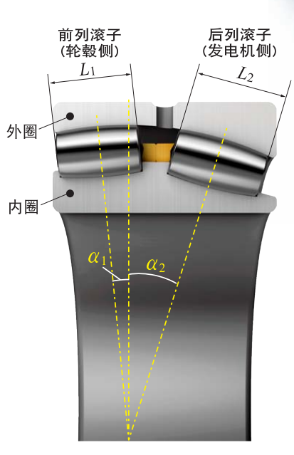 我們可以清晰地看到,后列滾子與滾道的接觸面,要大于前列滾子,由于受力傳遞,后列滾子與外圈有較大的載荷,而內(nèi)圈前列滾子一側(cè),會(huì)受到來(lái)自后列滾子的軸向壓力,因此才有了上圖所示造型。