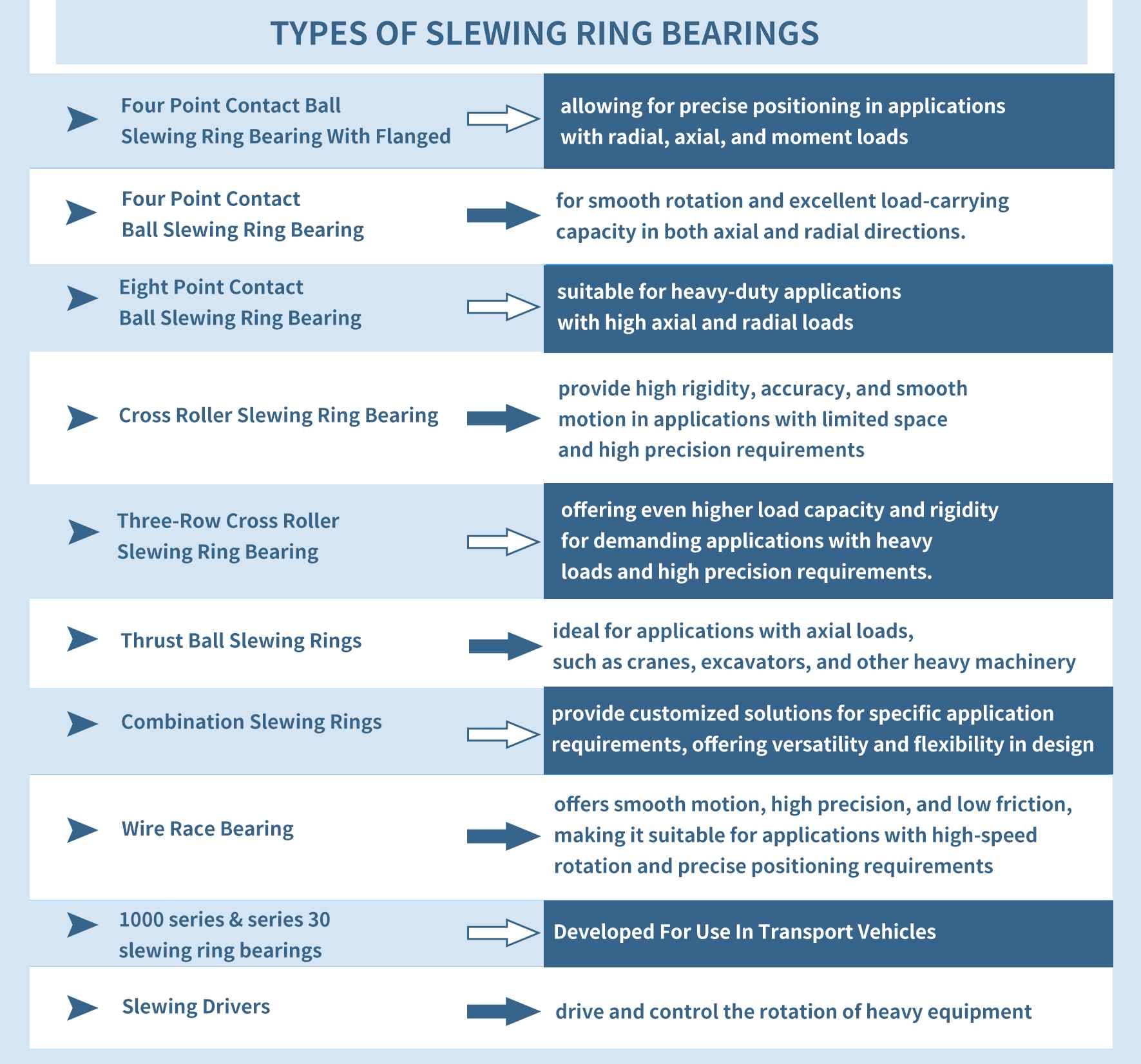回轉(zhuǎn)軸承為各種應(yīng)用中最苛刻的條件提供了多種解決方案,常用于包括重型設(shè)備、航空航天和國防、機器人、可再生能源、醫(yī)療系統(tǒng)等,在選擇回轉(zhuǎn)軸承為時,應(yīng)根據(jù)承載能力、剛度、操作條件、安裝、齒輪要求和維護來做出正確選擇。