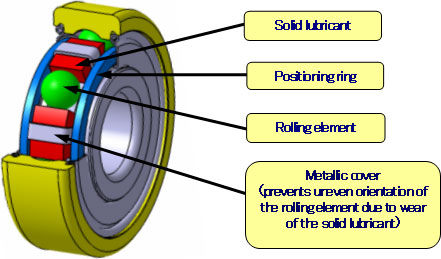 此外,該軸承還在防塵蓋和固體潤(rùn)滑劑之間安裝了一個(gè)定位環(huán),以幫助沿旋轉(zhuǎn)方向輸送潤(rùn)滑劑,確保滾動(dòng)元件(球)和潤(rùn)滑劑之間的理想接觸,從而實(shí)現(xiàn)更平穩(wěn)的旋轉(zhuǎn)。除了為軸承的滾道表面提供可靠的潤(rùn)滑劑供應(yīng)外,該設(shè)計(jì)還將旋轉(zhuǎn)扭矩降低到約1/4。在固體潤(rùn)滑劑上覆蓋金屬蓋有助于防止內(nèi)圈和外圈分離,即使固體潤(rùn)滑劑磨損嚴(yán)重,也可以正常使用。