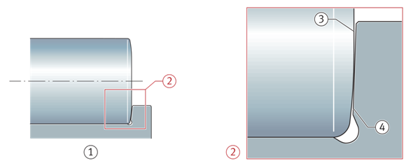滾子端面/肋面接觸幾何形狀 修改的滾子端面 ①帶內圈圓柱滾子軸承 ②詳圖(不按比例) ③滾筒末端 ④肋 | ![]() |