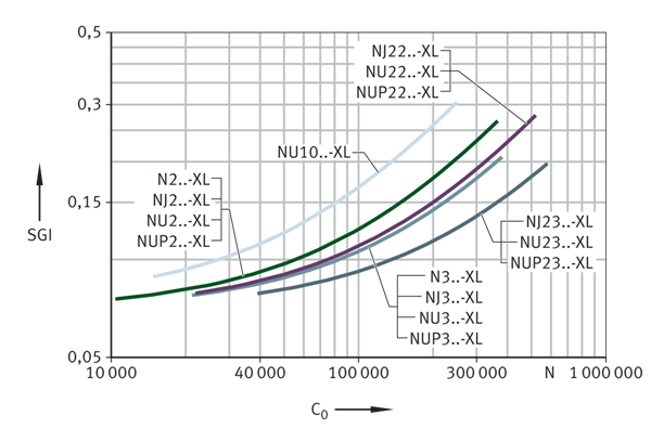 SGI值基于內部標準中軸承的最大允許噪聲水平,該標準是根據ISO 15242計算得出的。為了能夠比較不同的軸承類型和系列,將SGI值與基本額定靜載荷C0進行對比。