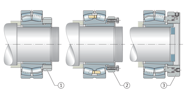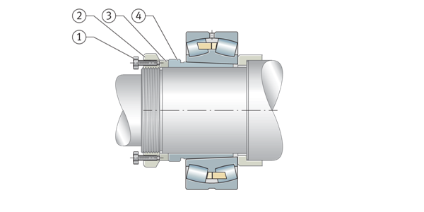 為了使退卸套不被壓入偏斜,首先將螺母擰緊到壓力環與退卸套完全接觸的程度。均勻分布在圓周上的壓力螺釘然后以橫向順序均勻擰緊,直到徑向內部間隙達到所需的減小。由于退卸套的錐形是自鎖的,因此可以拆下螺母;退卸套的位置由軸螺母固定。