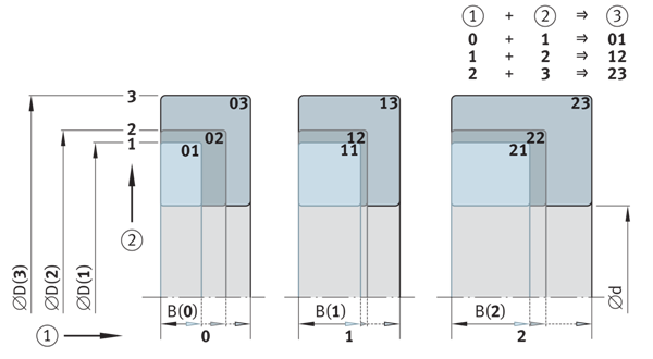 符合ISO 355的圓錐滾子軸承的尺寸計(jì)劃(摘錄) ①接觸角系列(接觸角范圍) ②直徑系列 ③寬度系列 | ![]() |