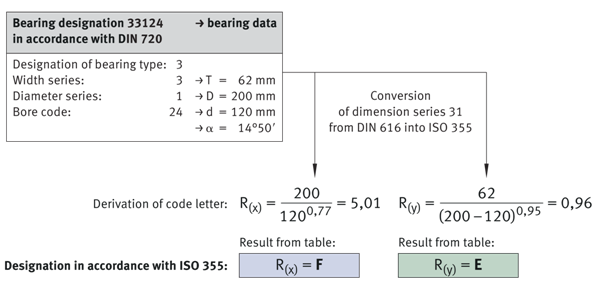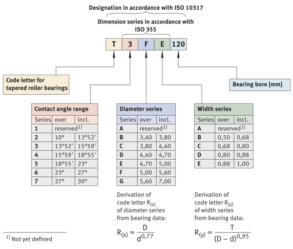 圖中舉例說(shuō)明了公制圓錐滾子軸承的名稱結(jié)構(gòu)(尺寸系列符合ISO 355,名稱符合ISO 10317)。3表示接觸角范圍。第一個(gè)字母(本例中為F)表示直徑系列。每個(gè)直徑系列都有一定的D/d(外徑/孔徑)比值。第二個(gè)字母(本例中為E)表示寬度系列。每個(gè)寬度系列具有軸承寬度T與軸承橫截面高度的一定比率。在開(kāi)始處加上字母T(用于圓錐滾子軸承),在結(jié)束處加上三位數(shù)字,表示軸承孔徑(單位為mm)(在本例中為120),即表示圓錐滾子軸承的完整名稱(T3FE 120)。