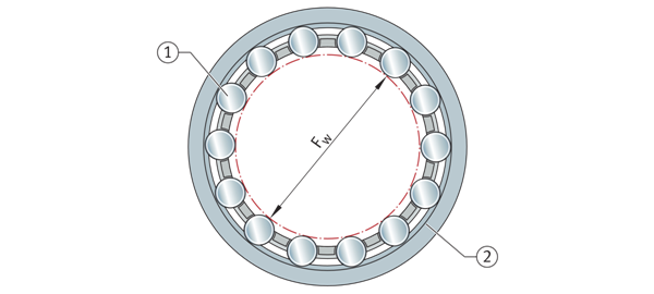 包絡(luò)圓 ①Fw=包絡(luò)圓直徑 ②滾動(dòng)元件 ③外滾道 | ![]() |