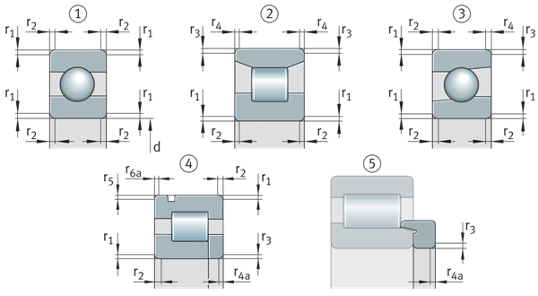 | 徑向軸承的倒角尺寸(不包括圓錐滾子軸承) ①對(duì)稱的圓環(huán)橫截面,兩個(gè)圓環(huán)上有相同的倒角 ②兩個(gè)環(huán)上具有不同倒角的對(duì)稱環(huán)截面 ③不對(duì)稱環(huán)形截面 ④外圈上的環(huán)形槽,帶肋墊圈的軸承 ⑤L形截面環(huán) | ![]() |