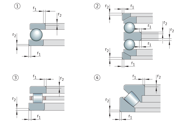 | 軸向軸承的倒角尺寸 ①帶平殼定位墊圈的單向軸向深溝球軸承 ②帶球面殼體定位墊圈和座墊圈的雙向軸向深溝球軸承 ③單向軸向圓柱滾子軸承 ④單向軸向調(diào)心滾子軸承 | ![]() |