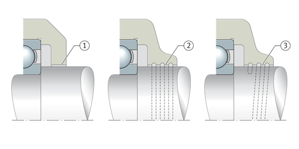 在使用機油潤滑且軸是水平的情況下,某些殼體中的通孔具有螺旋槽,根據相對于軸旋轉方向的螺旋方向,沿著軸爬行的油會返回到殼體中,或者污染物會從間隙輸送到外部。如果螺旋槽位于軸上,則可實現類似的密封作用。