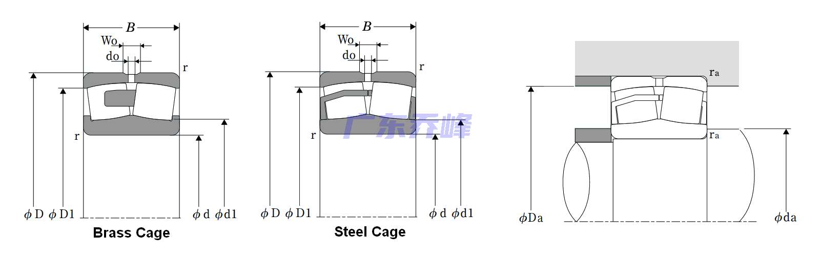 B:一體式機加工黃銅保持架,抗沖擊性好,剛度大(B型:每排一個機加工黃銅保持架)