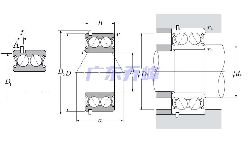 | 雙列角接觸球軸承 - 雙面防塵蓋帶止動(dòng)環(huán) - 尺寸 | |