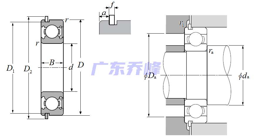 | 單列深溝球軸承 - 單面密封(接觸式橡膠密封)帶止動環 - 尺寸 | |