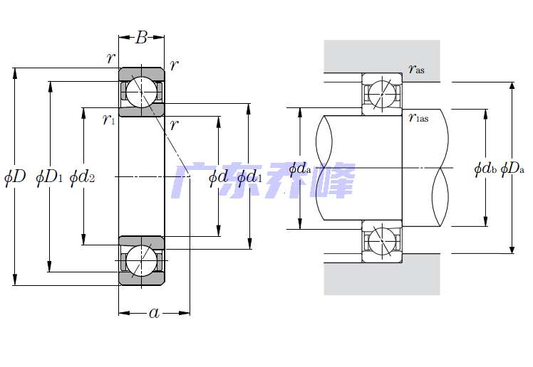 | 電機(jī)和車床用單列角接觸球軸承 - 尺寸 | |