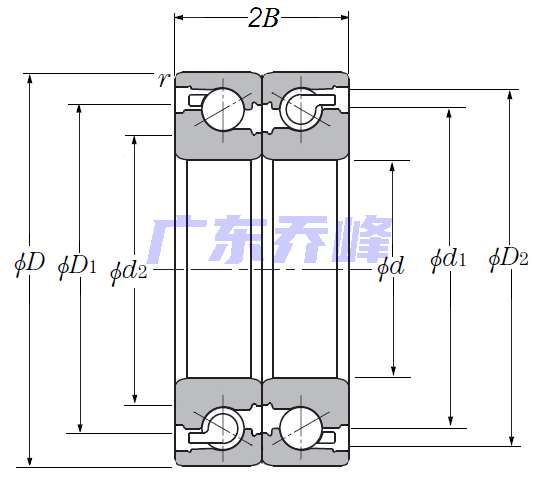 | 滾珠絲杠用雙角接觸推力球軸承 - 背對背配對,開式,一排承受軸向載荷 - 尺寸 | |
