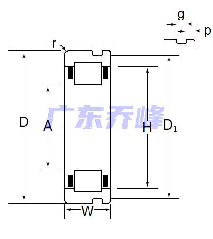 | 帶保持架和滾子的外圈,兩個(gè)加強(qiáng)筋&帶止動(dòng)環(huán)槽 in外圈 O.D. - 尺寸 | |