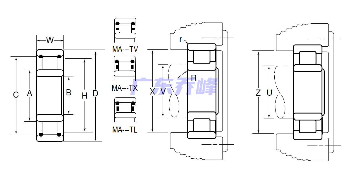 軸承型號:MA7311TL,圓柱滾子軸承 -可分離型,普通內圈,外圈帶兩個擋圈,其基礎型號為7311,前綴列表:【MA:M:NTN BOWER產品,標準公制尺寸系列,A:滑動內圈】,后綴列表:【T:外圈內徑中帶雙擋邊】【L:復合鋼保持架】