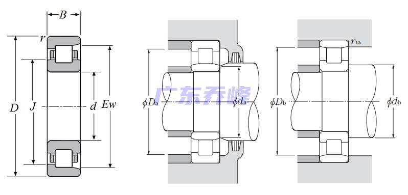 圓柱滾子軸承 -可分離型內圈帶兩個加強筋,外圈帶一個加強筋 - 尺寸