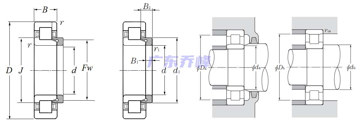 | 圓柱滾子軸承帶單擋邊內圈帶外圈&滾子組件,斜擋圈 - NH系列 - 尺寸 | |