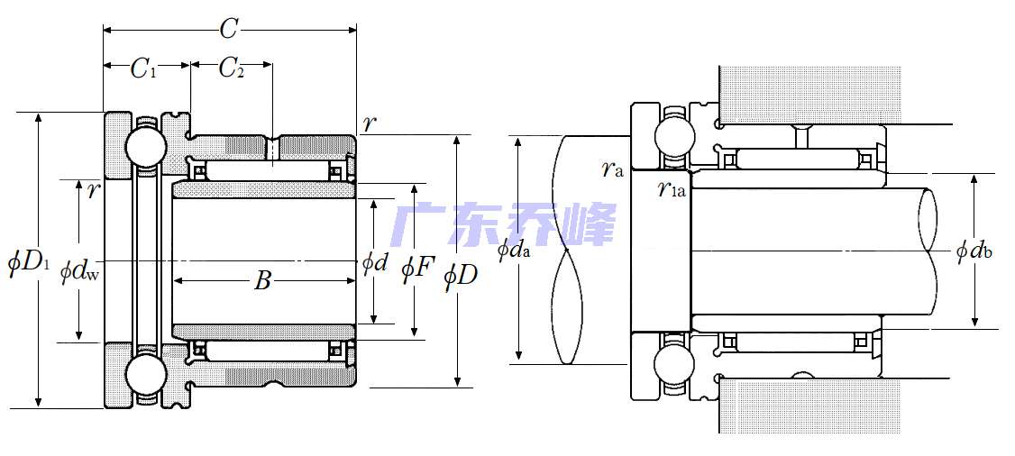 | 帶推力球軸承的滾針組合軸承 - 開式帶內圈 - 尺寸 | |