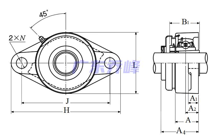 軸承型號:S-UKFL213D1(配合軸承:HE2313X),雙螺栓菱形法蘭式軸承座單元,鑄造外殼,帶緊定襯套,壓制鋼防塵蓋,開式端蓋,UKFL型