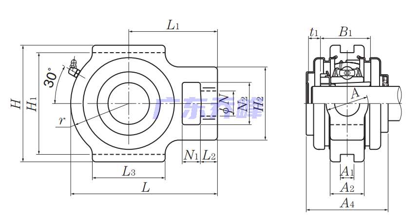 滑塊式軸承座,鑄造外殼,帶緊定襯套,壓制鋼防塵蓋,封閉端蓋,UKT型 - 尺寸